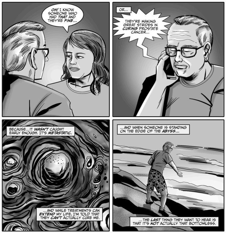 Unfortunately, his next project again had to deal with health issues again. Diagnosed with stage 4 prostate cancer, James Burns began recording his experience with EBRT (radiation therapy) in the comic 'The Death of Me?' (2025). The digital comic has been made available for free at malecare.org.