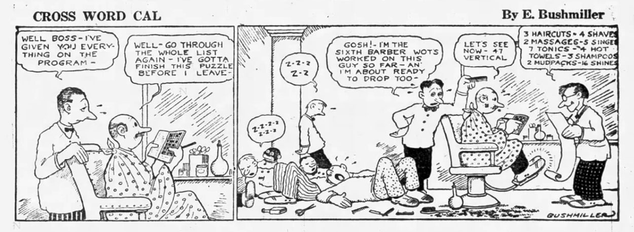 A few years before making his name as a newspaper cartoonist, Bushmiller mostly designed crossword puzzles for Pulitzer's The New York World, its Sunday World magazine and The Buffalo Courier, the latter owned by William James Conners. Bushmiller eventually livened up these crossword sections with illustrations and comics. In the Sunday World, he drew puzzles tying in with the work of illusionist Harry Houdini. In November 1924, the Buffalo Courier's crossword puzzle section ran one-panel gag cartoons drawn by Bushmiller, of which the punchlines were revealed once readers had filled in the crossword panels. By the spring of 1925, this concept grew into an actual gag comic titled 'Cross Word Cal'. The title character was a mustached man whose life featured many situations where he or other people had to think up words with "three, four, five or more letters."