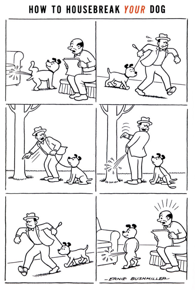 One particular gag by Bushmiller has gained notoriety for being unusually risqué, 'How To Housebreak Your Dog' (1961). It features a dog owner trying to train his pet to urinate outside. He demonstrates this by urinating against a tree. Once home, the dog whizzes against the couch again, but this time standing upright, like his owner showed him. Naturally, this joke was never part of the 'Nancy' or 'Fritzi Ritz' series, but appeared in a yearbook of the Dutch Treat Club, of which Bushmiller was a member. Despite the low circulation of this particular issue, 'How To Housebreak Your Dog' has been widely bootlegged since. It has been duplicated and plagiarized in numerous magazines, stencils, joke books, on cards and websites, not always giving credit to Bushmiller. Fugs bandmember Tuli Kupferberg once cut out a copy of 'How to Housebreak Your Dog' and added it to his collection of cartoons he liked.