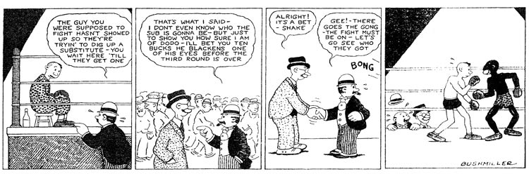After these first steps, Ernie Bushmiller developed a couple of short-lived features for other New York newspapers. In September 1924, nineteen-year old Bushmiller created 'Mac the Manager' for the sports page of the tabloid paper The New York Evening Graphic, published by Bernarr Macfadden. This gag-a-day comic revolved around an incompetent boxing promoter named Mac who tries to train a feather-brained boxer with a crew-cut called Dodo.