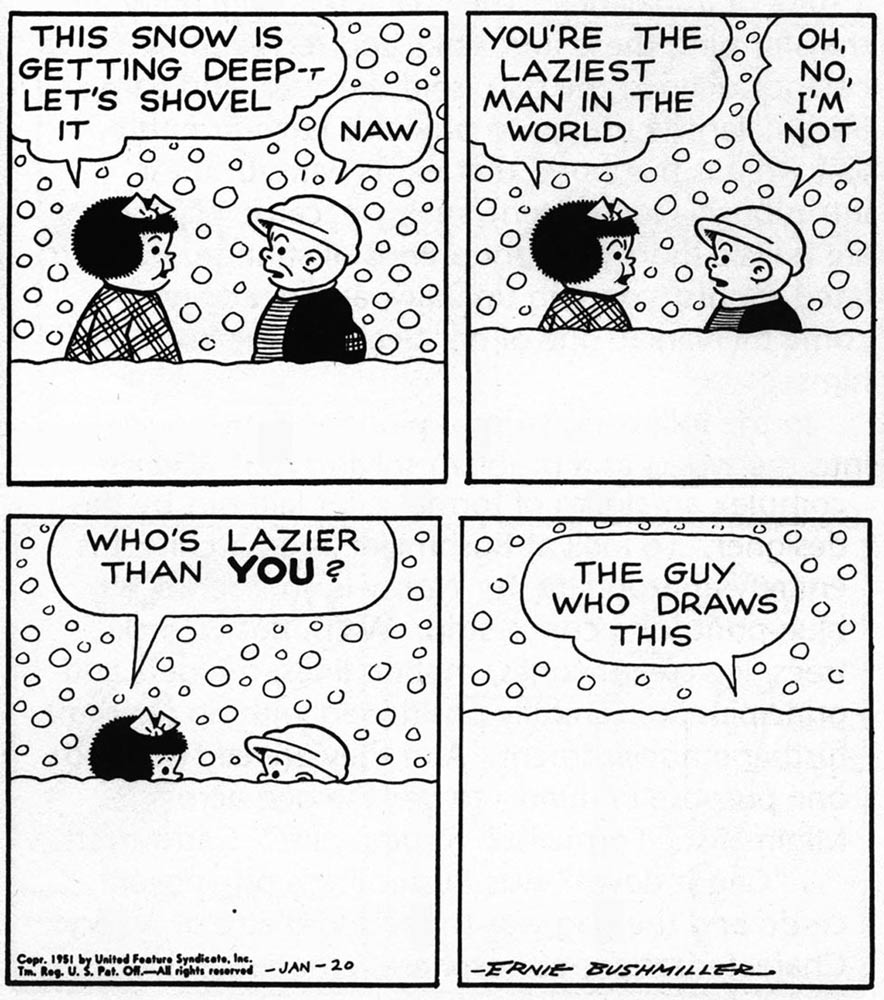 'Nancy' is indeed a masterpiece of minimalism. Mark Newgarden and Paul Karasik wrote an entire essay about it, 'How to Read 'Nancy' (1988)', which analyzes Bushmiller's commercial talent. As Wallace Wood once put it: "It takes less time to read Nancy than it does to decide not to read it." Bill Griffith paid homage to Bushmiller in a 'Zippy the Pinhead' gag named 'It's Bushmiller Time', in which Zippy informs Ernie that: "three rocks are the epitome of fun". Griffith saw Bushmiller as "a primitive artist, a kind of naïve genius, who had a lot more depth then even he or his audience understood. 'Nancy' is a Zen strip." In an interview with Julia Silverman for www.complex.com, the artist Jayson Musson also called Bushmiller "a secret genius", praising his tendency to give things a "pragmatic use or readily apparent function". If it didn't have that, it wasn't of value. The cartoonist and comics theorist Scott McCloud described 'Nancy' as "a comic so simply drawn it can be reduced to the size of a postage stamp and still be legible; an approach so formulaic as to become the very definition of the 'gag-strip'; a sense of humor so obscure, so mute, so without malice as to allow faithful readers to march through whole decades of art and story without ever once cracking a smile."