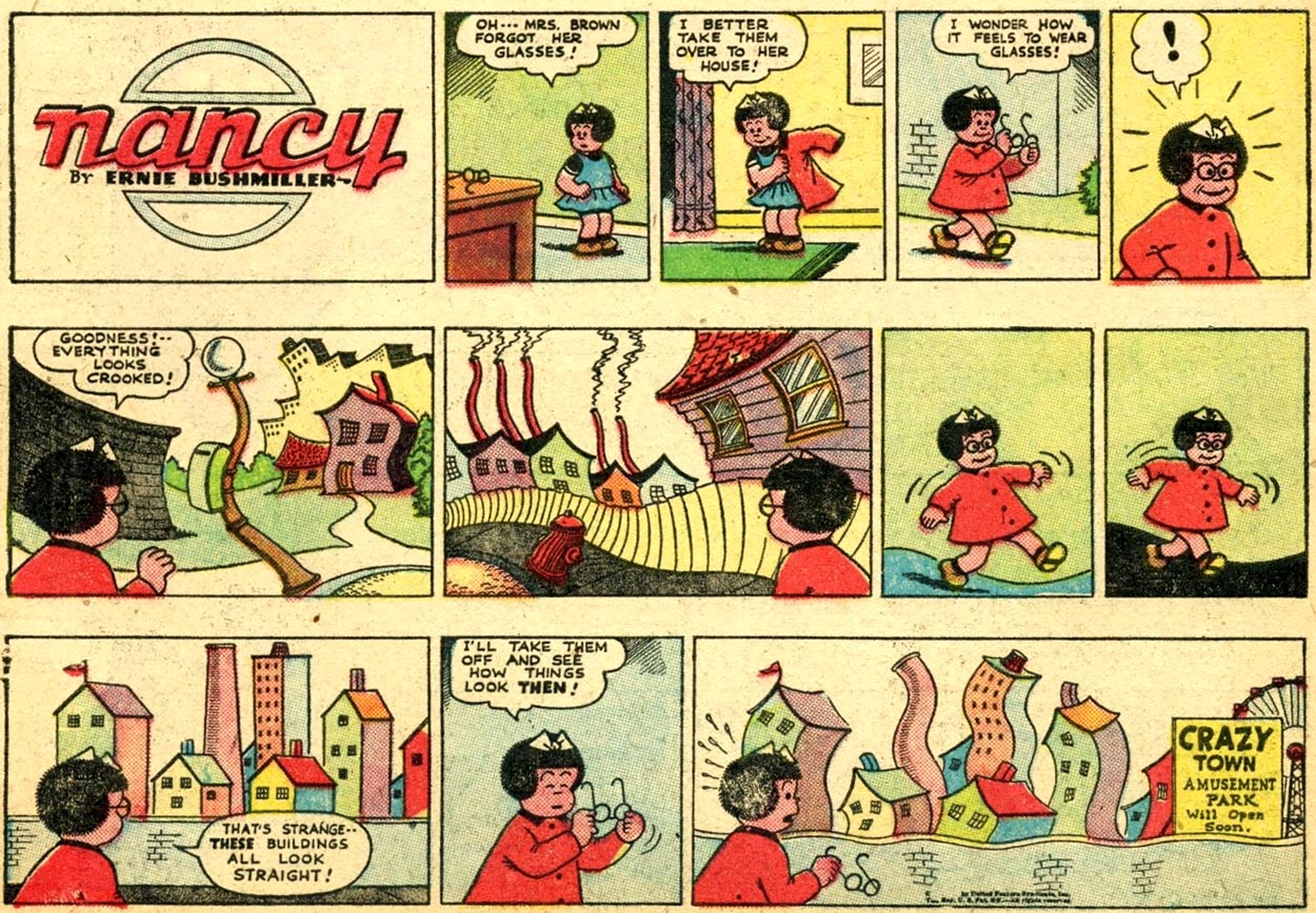 However, for such a family friendly comic, Bushmiller had an eccentric creative approach. Whenever he needed ideas he just paged through Sears catalogs. There was always some object that caught his attention, like, for instance, a rake, a plunger or a water pistol. Between Sunday and Tuesday evenings, he made all six of his required daily comics. After taking two days off, he spent Friday drawing his Sunday page. Bushmiller always started with the last panel, then worked his way back to the first. This may explain the sometimes odd atmosphere one can subconsciously feel in his drawings. Occasionally, Bushmiller used self-reflexive humor and had his characters break the fourth wall. In a 1947 cartoon, Nancy suddenly starts walking on the ceiling, just to state: "Anything can happen in a comic strip." In another gag, the whole scenery starts shaking, because "their boss" was just sharpening his pencil for a moment. In some jokes, Nancy and Sluggo even meet their creator Bushmiller.