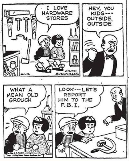 Ernest Paul (Ernie) Bushmiller was born in 1905 in the Bronx in New York City, the son of a bartender of German descent who also performed in vaudeville. After six months of high school, fourteen-year old Ernie dropped out and became a copy-boy with the newspaper The New York World, owned by Joseph Pulitzer. For a brief period, Bushmiller took evening classes in drawing from the National Academy of Design, but soon left because he felt he "couldn't draw". Most of his graphic skills were learned from observing his cartoonist colleagues at the New York World and the New York Sunday World. His first steps in newspaper cartooning were done as a speech balloon letterer. For the 30 March 1921 newspaper, Bushmiller was asked to illustrate a comedic situation thought up by editor Sidney Barrett. He adapted it in comic strip format under the title 'How To Walk Five Miles in Five Minutes'. Bushmiller's first solo comic, 'Special Rates For Actors', appeared in print on 29 January 1922.