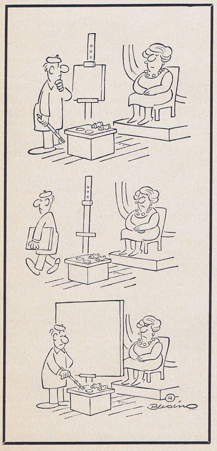 Busino began his enduring collaboration with the Saturday Evening Post. While remaining a contributor to this magazine throughout his career, he also published his gag cartoons in McCalls, Reader's Digest, Good Housekeeping and Boys' Life. On occasions, Busino also assisted his good friend Bob Weber Sr. on his 'Moose Miller' newspaper strip.