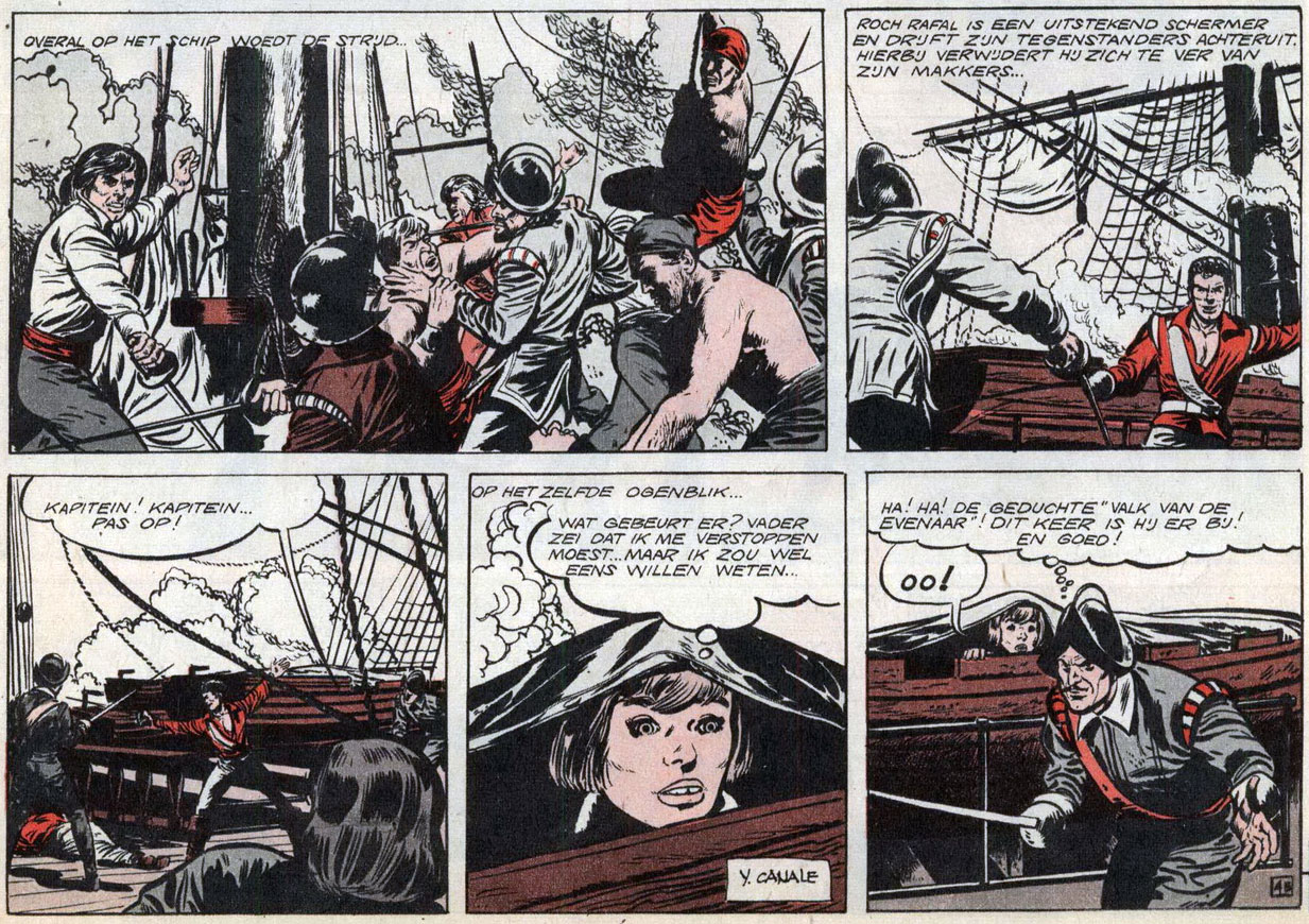 Canale was the first wife of the comic artist Gérald Forton, with whom she moved to Brussels, Belgium. From 1952 on, Forton became a regular contributor to Spirou, and by 1963, Canale was also present in the pages of this magazine, drawing the pirate comic serial 'Roch Rafal'. Written by Jean-Jacques Marine - also the scriptwriter of several series drawn by Canale's husband - Roch Rafal is a 17th-century filibuster who collides with the Spanish forces in the Caribbean Sea. As a reward for his heroism, he is knighted by Louis XIV, and becomes a privateer in service of the throne. Because of problems between Canale and her publisher, she only drew the first 'Roch Rafal' episode, 'Le Faucon des Tropiques' ("The Falcon of the Tropics", 1963). The second and final installment, 'A Pleines Voiles vers l'Aventure' ("Full Sail Towards Adventure", 1964) was drawn by Jacques Métayer.