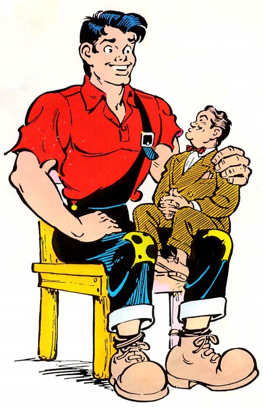 The feature's hero, Abner, is a super strong young man. He owes his strength to his mother, Mammy Yokum, who, despite her advanced age, is very feisty. Unfortunately, Abner inherited his intelligence from his feather-brained father Pappy. Abner is often fooled by tricksters and frequently gets himself into trouble. His girlfriend Daisy Mae usually has to help him out. The two seem a good match, but each time Daisy asks Abner to marry her, he runs away. Daisy chasing Abner became the series' most famous running gag. The final member of Abner's family is the pet pig, Salomey.