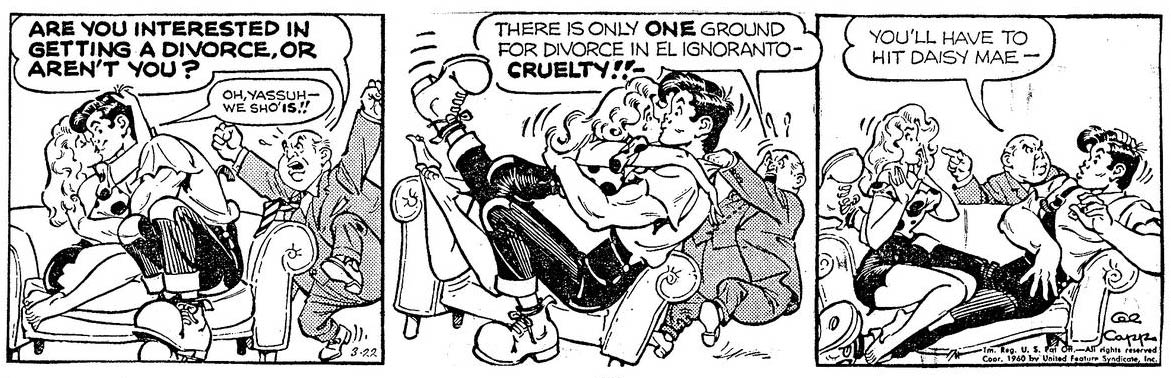 In 1954, Daisy Mae is reading the latest 'Fearless Fosdick' episode and is curious whether Fosdick and his sweetheart Prudence will get engaged in the next episode. Abner dismisses this cliffhanger as "the usual comic strip trick to keep stupid readers excited." The irony continues when Abner proposes to Daisy Mae afterwards and they get married. His prediction about Fosdick turns out to be true: in the next episode, Fosdick and Prudence break off their engagement, restoring the status quo. He and Daisy Mae, on the other hand, stayed married for the rest of the series.