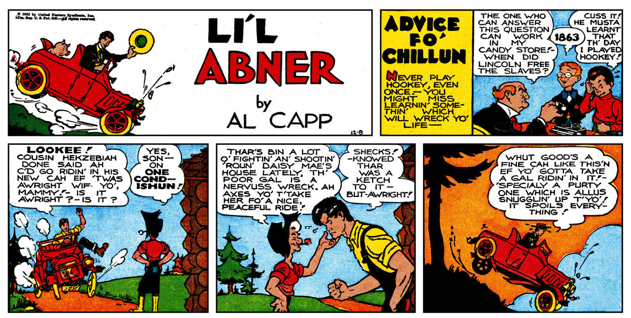 'Li'l Abner' Sunday comic of 8 December 1935 with 'Advice fo' Chillun' topper.