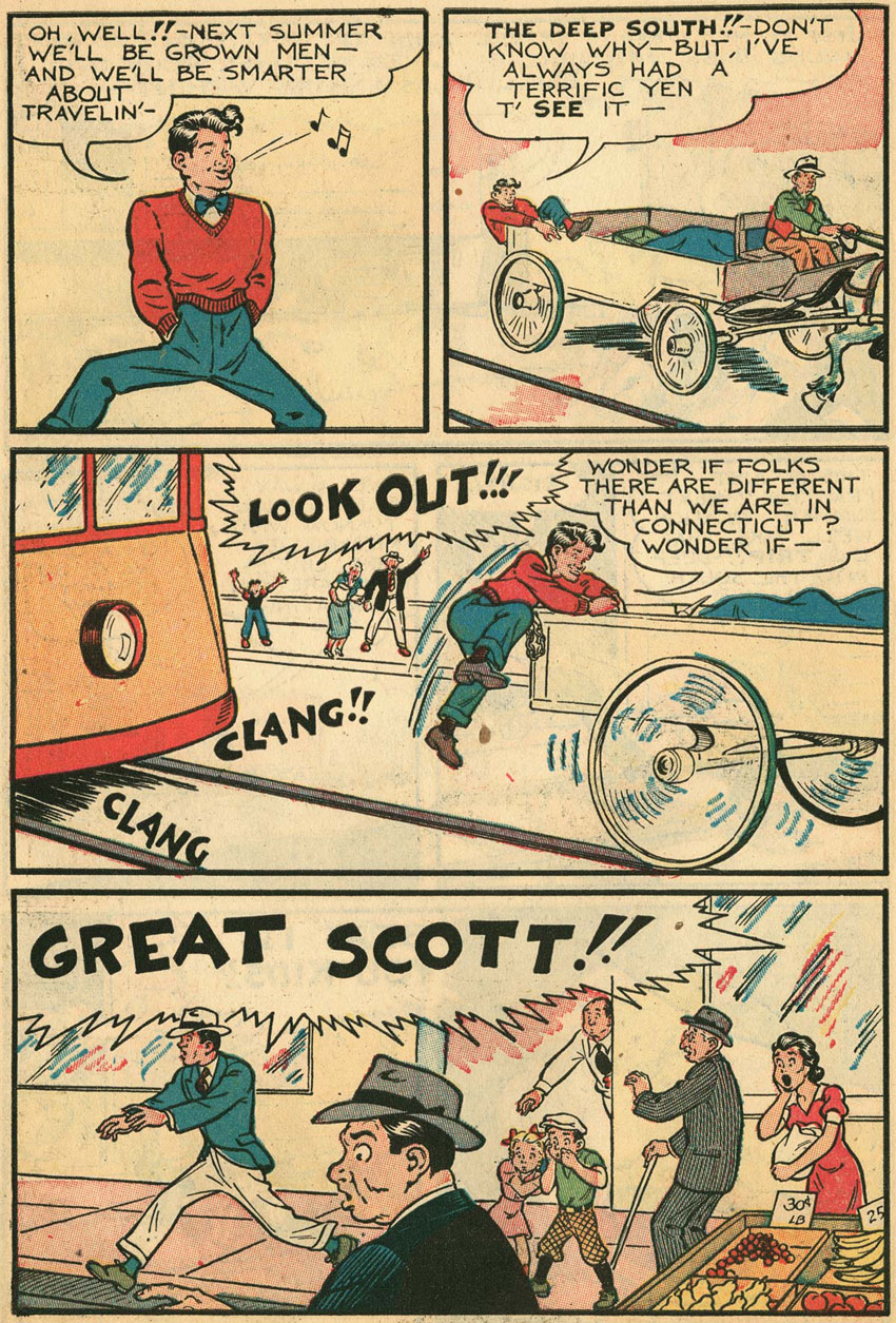The main character of 'Abbie an' Slats' was Aubrey Eustace Scrapple, nicknamed "Slats". He is a New York youngster, whose parents have just died. The street-wise orphan decides to leave the city and move to a small rural town, Crabtree Corners, where his older cousin, Abigail Scrapple, lives. Abigail is a spinster, who lives together with her sister Sally. In his new hometown, Slats falls in love with Judy Hagstone, unfortunately the daughter of a cold-hearted businessman, Jasper Hagstone. The man hates Slats because his car once crashed into his limousine. Slats wanted to avoid running over a dog and had no other choice than steer his vehicle away, hereby accidentally crashing Hagstone's prestigious automobile. Later in the series, Slats' heart is won over by another pretty young woman, Becky Groggins, the daughter of eccentric inventor J. Pierpont "Bathless" Groggins. Pierpont soon became ‘Abbie and Slats' breakthrough character. His wacky inventions and adventures across the seven seas drove many plots forward.