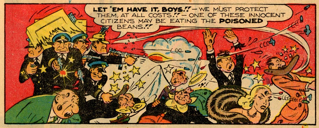Capp's most notable parody was introduced on 30 August 1942: 'Fearless Fosdick', a spoof of Chester Gould's comic strip sleuth 'Dick Tracy'. Fearless Fosdick basically looks like Tracy, but with an added moustache. Capp pushed the cartoony villains and gruesome violence in 'Dick Tracy' completely over the top. He also gave 'Fearless Fosdick' a creator: the "famous" cartoonist Lester Gooch, who is depicted as a nervous wreck, constantly writing himself into a corner and then stressing out for being unable to solve his plotline before next week's deadline. 'Fearless Fosdick' quickly became a running gag and the first known example of a "comic within an a comic".