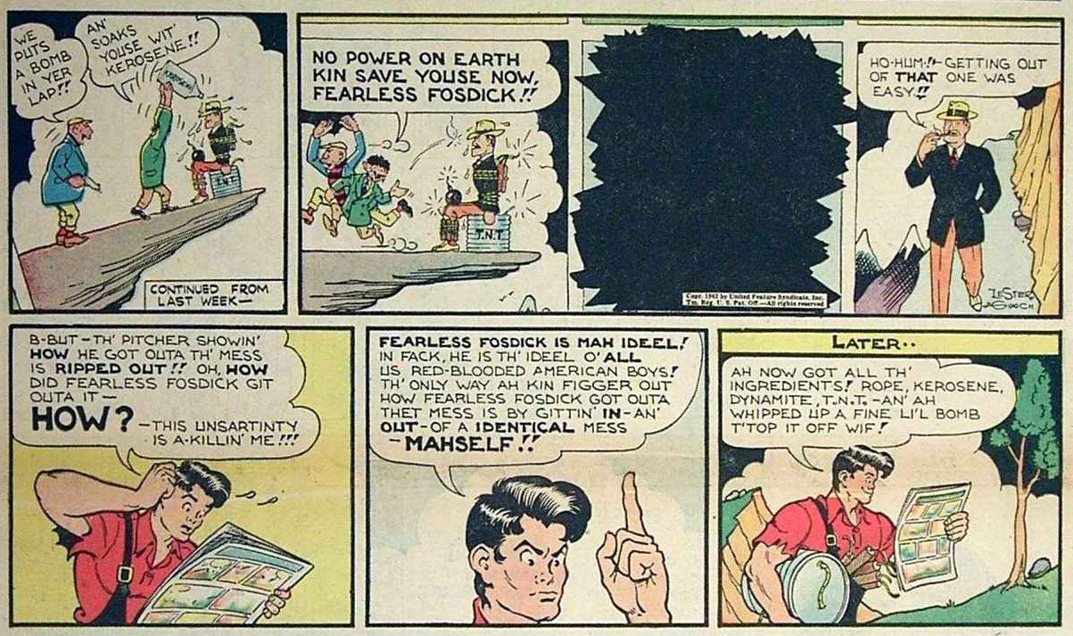 In his 'Li'l Abner' comic, Al Capp enjoyed breaking the fourth wall, usually through his comic-within-a-comic 'Fearless Fosdick'. On 29 November 1942, for instance, Abner receives the funny pages, but notices a panel is missing in the 'Fearless Fosdick' comic. As a result, he has no clue how his hero managed to save himself from a sticky situation. Soon after, Abner is placed in the exact same life-endangering threat as Fosdick, wishing that he knew how Fosdick "got out of this mess." In the next episode, it turns out Abner was only dreaming. When he eventually obtains an undamaged version of the Fosdick comic he read earlier, he finds out that Fosdick was also saved by the exact same corny "it was all a dream" plot device.
