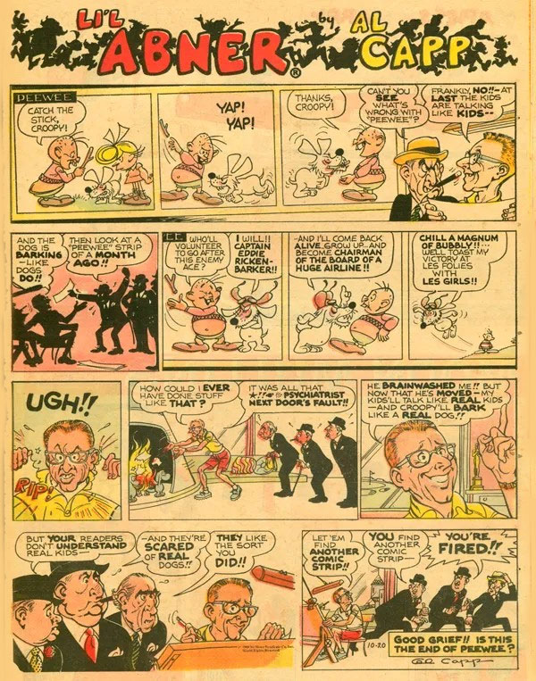 As beloved as 'Li'l Abner' was, its satire didn't always please its readers. In September 1947, the series was pulled from papers by Scripps-Howard, the syndicate that owned United Feature, over a storyline mocking the U.S. Senate. Edward Leech, head of Scripps, commented that portraying the Senate "as an assemblage of freaks and crooks… boobs and undesirables" wasn't "good editing or sound citizenship." Interestingly enough, Capp once seriously considered running for a seat in the Senate of Massachusetts. Also polarizing audiences was the famous storyline about the Shmoos, innocent creatures targeted by the "crommunist" government of Lower Slobbovia and exterminated by tycoon J. Roaringham Fatback for being "bad for business". Left-wing people interpreted it as mocking socialism and communism, while right-wingers felt Capp lampooned capitalism. In the 10 October 1948 broadcast of 'The Author Meets the Critics', Capp had a live radio debate with psychiatrist Dr. Fredric Wertham. The latter went so far as to link the Shmoo to Nazi war criminal Ilse Koch. Nearly a decade later, between 21 July and 14 August 1955, 'Li'l Abner' featured a storyline in which a caricature of Wertham made a cameo.
