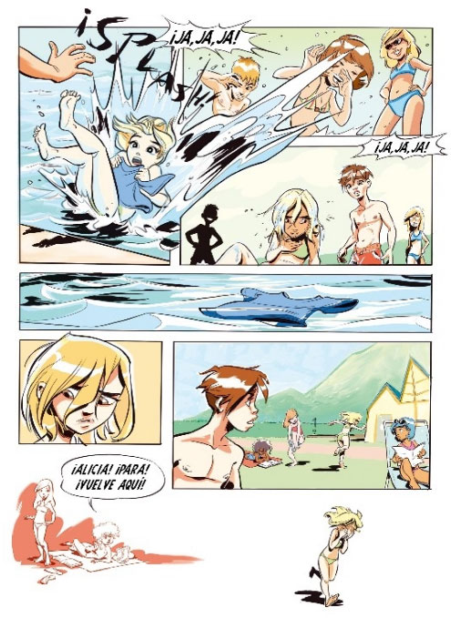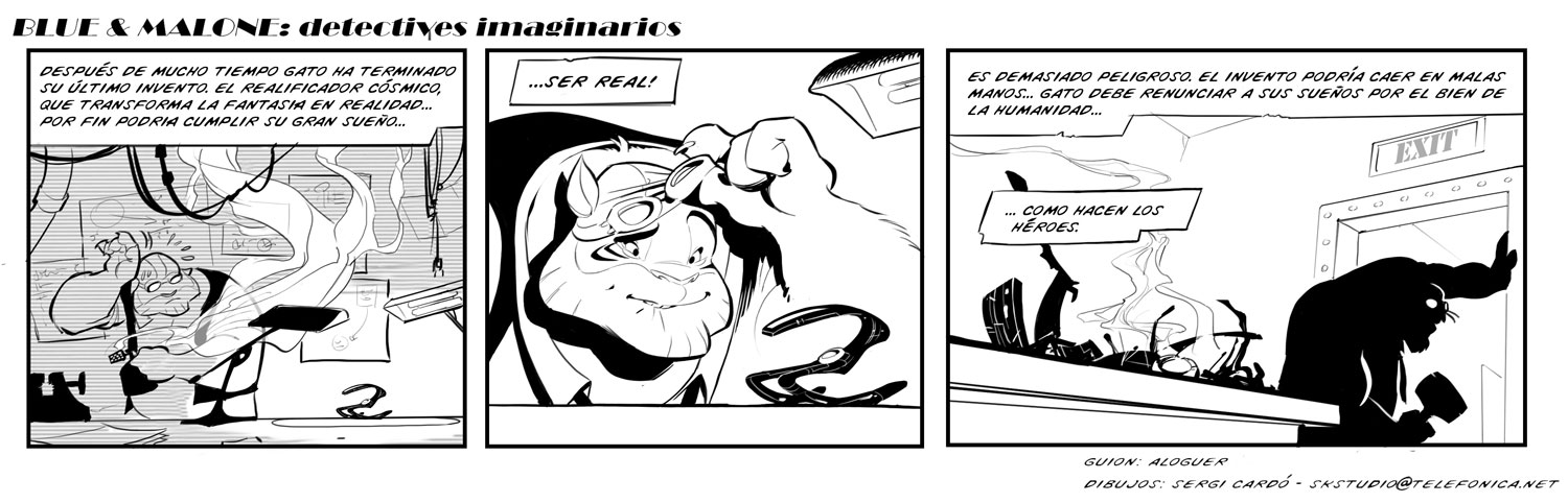 Through the communication agency Kidekom, Sergi Cardó provided the artwork for the children's healthcare comic books 'La Muestra del Valor' (Menudos Corazones Foundation, 2008), supporting children and young people with congenital heart disease, and 'Marcos en Apuros' (2008) and 'Un Gigante en la Pandilla' (2012), both for the "Vivir en Salud" program of the Mapfre Foundation, aimed at emotional well-being, healthy and sustainable eating and physical activity for children. Cardó's other print media artwork has included school book illustration for ProcessElt, wear design for Promise and advertising art for Aquahotels. For the production company El Viaje Imposible, Cardó did character design and concept art for the awarded 2013 short 'Blue & Malone, Detectives Imaginarios'. From scripts by the film's director Abraham López Guerrero, he also made some advertising comic strips with these characters.