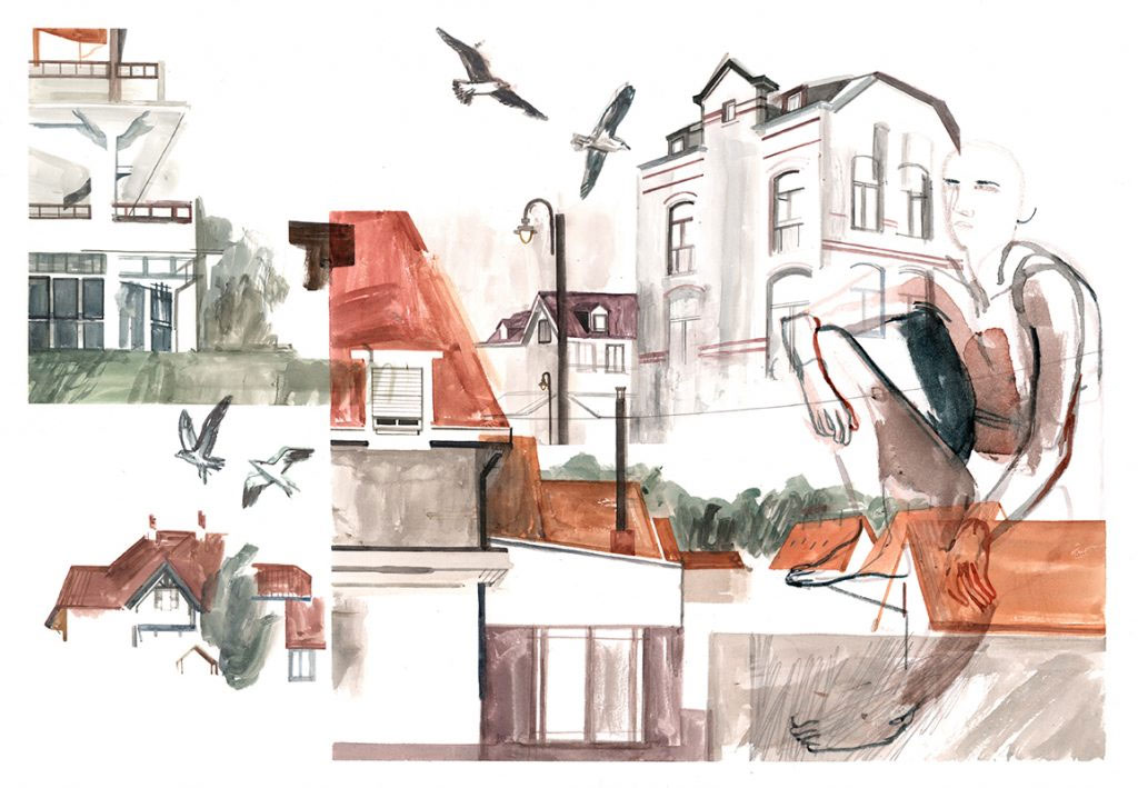Shortly after the release of her graphic novel, the book '(On)voltooid Verleden Tijd' (2016) appeared, a compilation of a series of columns by Cardon with Dutch columnist/novelist Arnon Grunberg. During the summer of 2015, the duo had serialized the work in the newspaper De Standaard. It followed a loose narrative about a man with memory problems and how his silent wife witnesses his decline. Grunberg wrote the text, while Cardon made the illustrations. Each worked alone and shared their ideas and contributions through WhatsApp. That way they could inspire each other and send the improvised story into different directions.