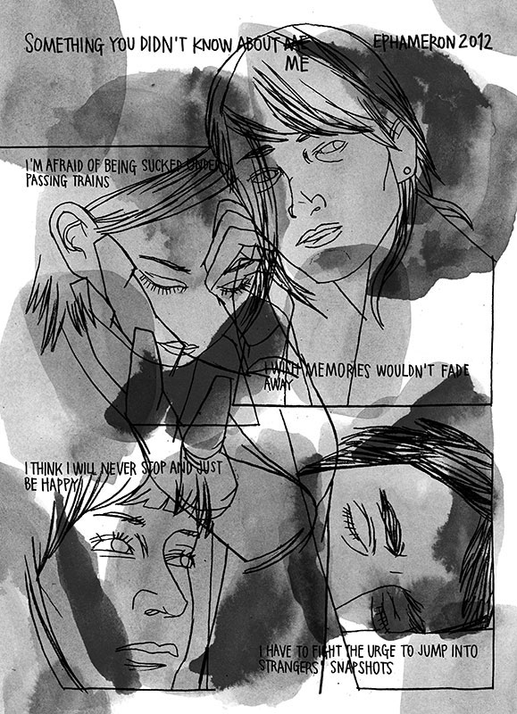 Eva Cardon, who uses the pseudonym Ephameron, is a Belgian comic artist and illustrator. Her autobiographical work is inspired by everyday events and contemplates the transience of life. According to her website, Ephameron "explores a sensitive side of the world, where small and intimate dramas of life are documented." The artist uses sober, atmospheric colors, collage techniques and simple materials like pens and Tipp-ex. Her most celebrated graphic novel is 'Wij Twee, Samen' (2015), a powerful and moving work about her late father's struggle with dementia. In 2019, this book was translated into English as 'Us Two, Together'. Her 2021 book 'Nooit Meer Alleen' visualised experiences of early motherhood.