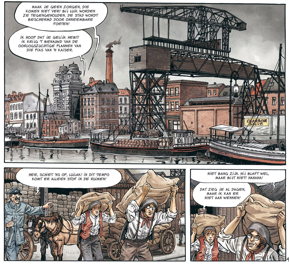 Instead of continuing to work on Gilles Chaillet's 'Vasco', Francis Carin embarked upon a project closer to home, writing and drawing the two-volume 'Ennemis de Sang' ("Blood Enemies", 2014-2016). Published by Glénat, the series was inspired by Carin's grandfather, a worker who had come from his native Flanders to make a living in the Liège coal mines. Making the project a true family effort, Carin teamed up with his son David Caryn to produce the artwork. The story is however purely fictional, telling the tale of two twin brothers who are separated at the age of six months, and raised in different social environments. Set on the eve of the First World War, Carin paints a picture of a new industrialized Belgium with its social inequality and upcoming worker's movement. The time period's class struggle is embodied by the young Omer, who comes from a wealthy family, but is kidnapped and raised by a Flemish family of workers who try to cope with the loss of their stillborn child. To cover up their crime, the couple begin a new life in the mining region of Liège. As a young man, Omer has to find a way between his two realities. While he grows up in a worker's environment, his twin brother is still part of the upper class.