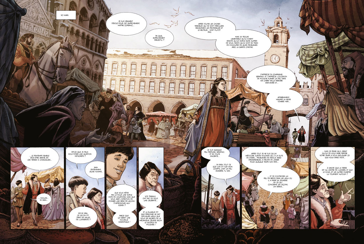 To expand his career opportunities, Carloni set out to present his work to Franco-Belgian publishing houses at the comic festivals of Lucca and Angoulême. It landed him his first assignment with the Swiss publisher Paquet, drawing the sole volume of the car racing series 'Siclair' (2014), written by Laurent-Frédéric Bollée. While he was working on this album, he was contacted by Éditions Soleil to draw 'Les Savants' (2016), a diptych starring medieval scientists, written by Luca Blengino. In the first volume, 'Ferrare, 1512 - Du Plomb en Or', Copernicus and Paracelsus investigate a homicide. The setting for the second installment, 'Uraniborg, 1594 - La Bête de l'île', was Sweden, where Galileo and Kepler investigate through snowy landscapes and a labyrinth of castles. Meeting with positive critical reception and international translations, the series enhanced Carloni's visibility, and resulted in his ongoing association with the Daniel Maghen art gallery.