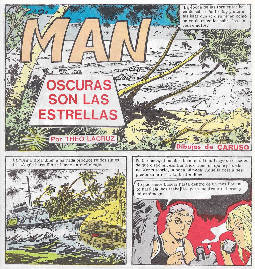Between 1988 and 1996, Caruso worked with writer Theo Lacruz (Eugenio Zappietro) on 27 episodes of the naval adventure series 'MAN', about a man who traveled by ship through Asia fighting pirates. It was published in El Tony Todo Color and its annuals. Also for El Tony, he drew episodes of the war feature 'Brigada Madeleine' from scripts by Guillermo Fernández Morán. Originally created by Héctor Germán Oesterheld and Gómez Sierra, additional artists for the comic were Néstor Olivera, Merel and Navarro.