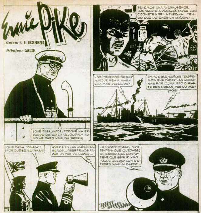 Caruso continued his career at Editorial Frontera. Starting in 1961, he contributed to Hora Cero Extra and Frontera Extra, drawing episodes with Héctor Germán Oesterheld and Hugo Pratt's war reporter 'Ernie Pike', and also installments of its spin-off 'Del Cuaderno Rojo de Ernie Pike' ("From Ernie Pike's Red Notebook"). By 1963, he appeared in Fuego!, a similar war title published by EDMAL (Editorial Manuel Láinez), where he drew 'Arenas Infernales' ("Infernal Sands"). In the following year, Caruso drew comics like 'El Inspector Fuentes' and 'Arenas en Llamas' ("Burning Sands"), published in Editorial Abril's Misterix as well as the evening newspaper El Siglo by Editorial Haynes.
