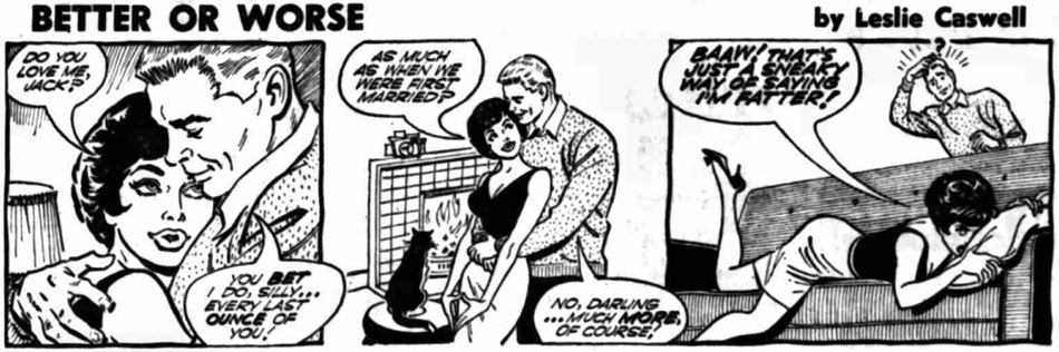 During the 1960s, Leslie Caswell was also active as a newspaper cartoonist. At the Daily Mirror, he drew episodes of Steve Dowling's humor strip 'Keeping Up With The Joneses' (1960-1961). Between 1961 and 1964, his experience in fashion illustration came in handy when he worked on the elegantly drawn humor strip 'Better Or Worse' in The Daily Herald. Written by Peter O'Donnell, the daily episodes featured the everyday life of newlyweds Jack and Jill. When the strip transferred to The Sun in 1964, Frank Langford became the new artist. Later episodes, appearing under the title 'Jack and Jill', were written by Les Lilley. The British 'Better or Worse' strip should not be confused with the Canadian strip 'For Better Or Worse' by Lynn Johnston.