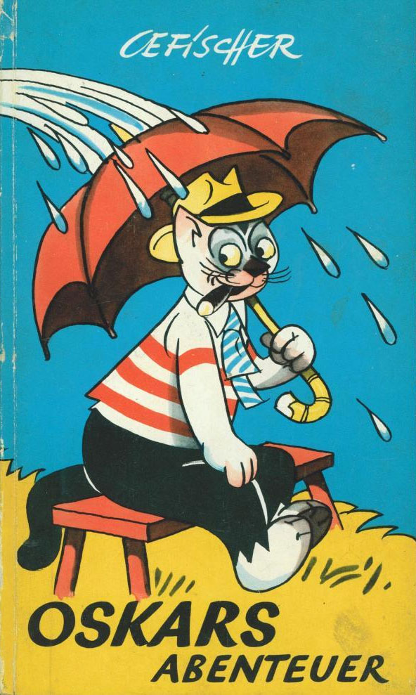 On Christmas 1952, Fischer launched his most recognizable comic character to the readers of the Frankfurter Illustrierte: the cat Oskar. The idea for the feature came from the magazine's editor Werner Wirthle, who had witnessed the success of Pat Sullivan and Otto Messmer's 'Felix the Cat' in England and wanted something similar in his magazine. However, the character originated in another strip Fischer made for the magazine, about sorcerer's apprentice 'Simsala Bimbo'. In that feature's final installment, Oskar managed to conjure his entire family out of a top hat with a magic wand, followed by an announcement for a new comic. Under the titles 'Oskar und seine Familie' and 'Oskar der Familienvater', the feline's everyday adventures ran in the Frankfurther Illustrierte for ten years.