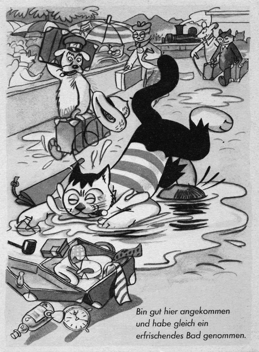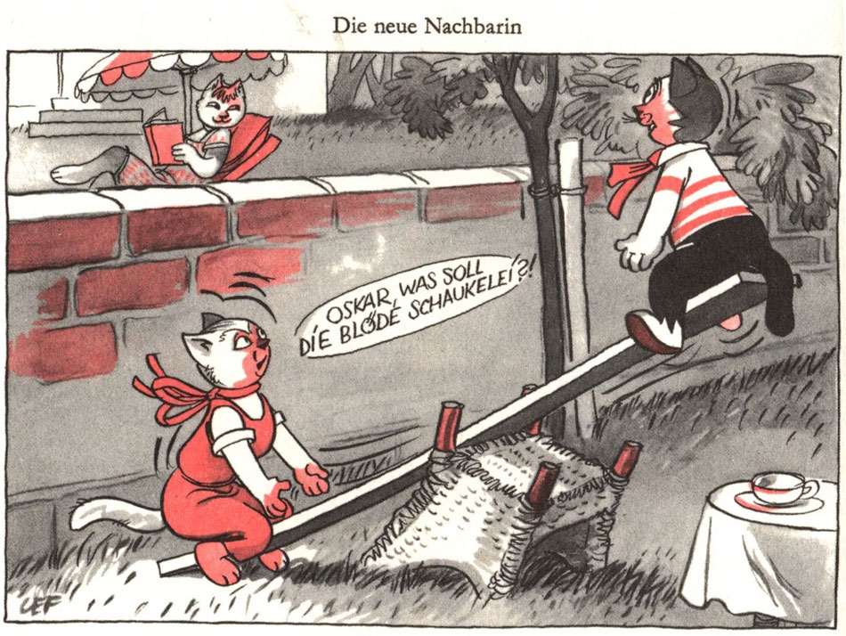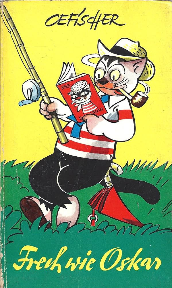 Dressed in a red-and-white striped sweater, Oskar is the head of a family of cats, whose everyday and all-too-human adventures gave a good impression of family life in post-War Germany. Together with his wife, only referred to as "Mommy", Oskar has five children - three boys and two girls - who are constantly trying to play pranks. The family wages a petty war against grumpy neighbors and unwanted visitors. Seven stories were collected in book format by the Frankfurter Societäts-Druckerei, with a total print run of 550,000 copies, and the artist received fan mail from all over the world, including Ecuador, Japan and Iran. The character became so popular that the feature also spawned dolls, games and paint books for children.
