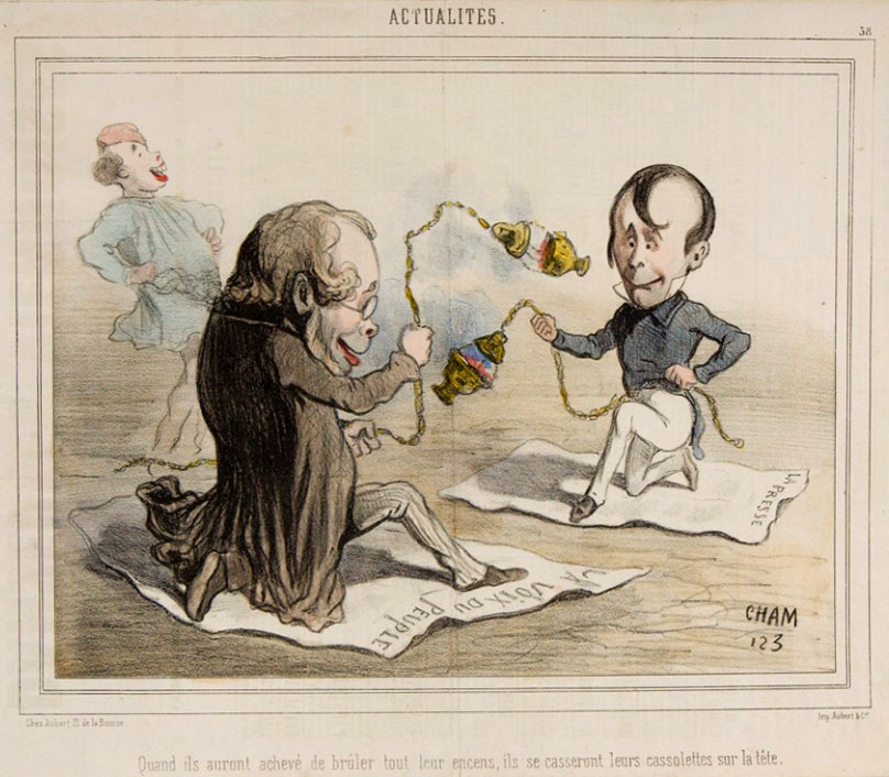 'Actualités'. A cartoon by Cham in which the "voice of the people" (left) and the press (right) combat each other. Translation: "When they managed to burn all their incense, they hit each other on the head with their casseroles."
