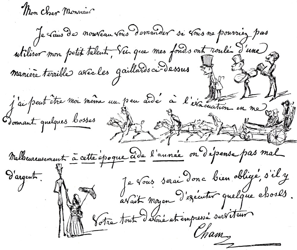 Illustrated letter requesting work, published in L'Autographe on 1 June 1872. The tall man holding a woman with an umbrella's hand is a self-caricature.