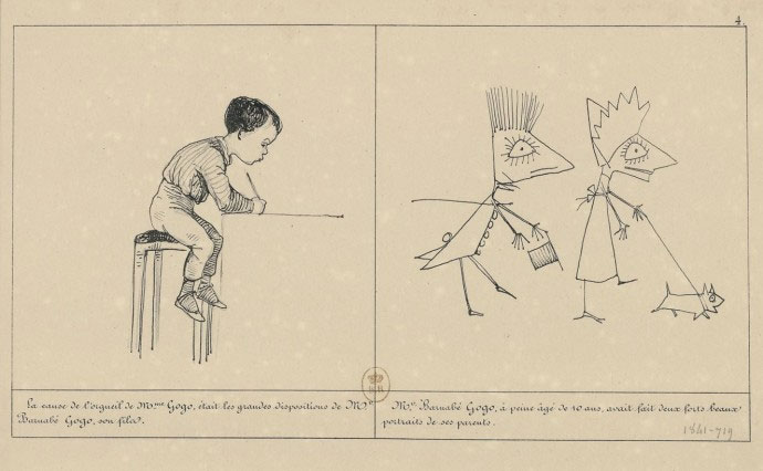 Cham's text comic 'Un Génie Incompris (M. Barnabé Gogo)' (1841) shows a similar self-awareness. The story follows a young boy who dreams of becoming an artist, but even as an adult his drawings look as if a kid made them. He is rejected by the Académie des Beaux Arts, yet in an ironic conclusion decides he's at least good enough to become a caricaturist. The story shows Cham's gift for self-mockery, but is also historically significant for being the first comic strip in which an adult imitates a children's drawing style, paving the way for comics like Felix Hess' 'Uit het Kladschrift van Jantje' (1916) and Jack Mendelsohn's 'Jacky's Diary' (1959). Some sources incorrectly claim that Cham also drew 'Histoire de Mr. de Vertpré et de Sa Ménagère aussi' (Aubert, 1840), but in reality the author was Eugè̀ne-Hippolyte Forest.