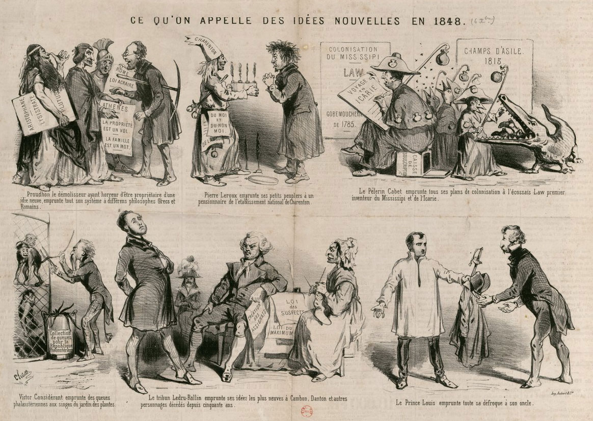 'Ce Qu'on Appelle des Idées Nouvelles en 1848', anti-socialist cartoon by Cham, featuring Pierre-Joseph Proudhon, Victor Considerant, Pierre Leroux, Étienne Cabet, Alexandre Auguste Ledru-Rollin and Louis Napoléon Bonaparte.