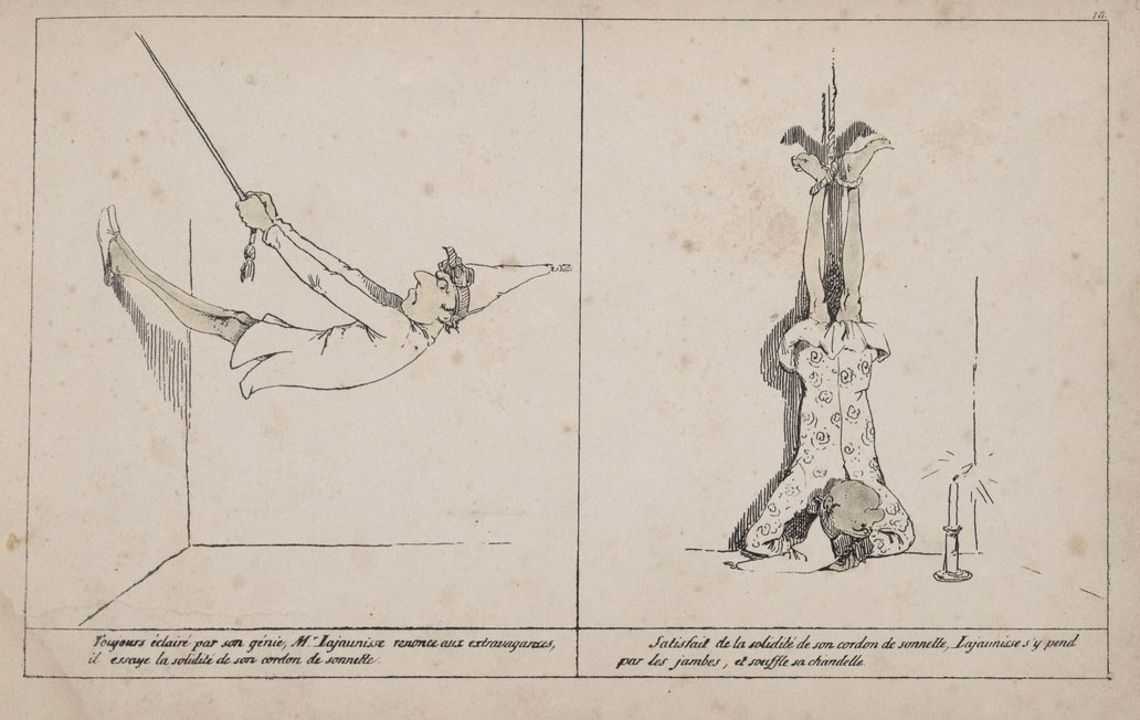 On 27 February 1839, Le Charivari published Rodolphe Töpffer's 'Histoire de Mr. Jabot', to cash in on the popularity of this new phenomenon: comics. Halfway through the serialization, the originals were clumsily redrawn by a staff member (possibly Cham?) to save costs. Publishing company Aubert nevertheless brought these plagiarisms out in book format, without crediting or paying Töpffer. Eventually, Le Charivari's chief editor, Charles Philipon, got an even better idea to save money. He asked Cham to create a comic strip "in the style of Töpffer", which on 3 August 1839 led to 'Histoire de Monsieur Lajaunisse, Malheurs d'un Beau Garçon', followed two months later by 'Monsieur de Lamélasse' (1839). Cham took his commission rather literally. Not only did he copy Töpffer's graphics neatly, he even stole entire gags and plot lines. The fact that both books were published anonymously further added to the confusion that these were original Töpffer stories. But they sold well and saved the magazine from impending bankruptcy.