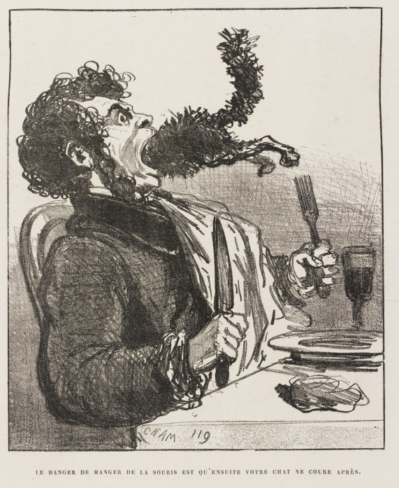 'Le Danger de Manger de la Souris est qu' ensuite Votre Chat le coure après' ('The danger of eating a mouse is that your cat will jump after it', 1870).