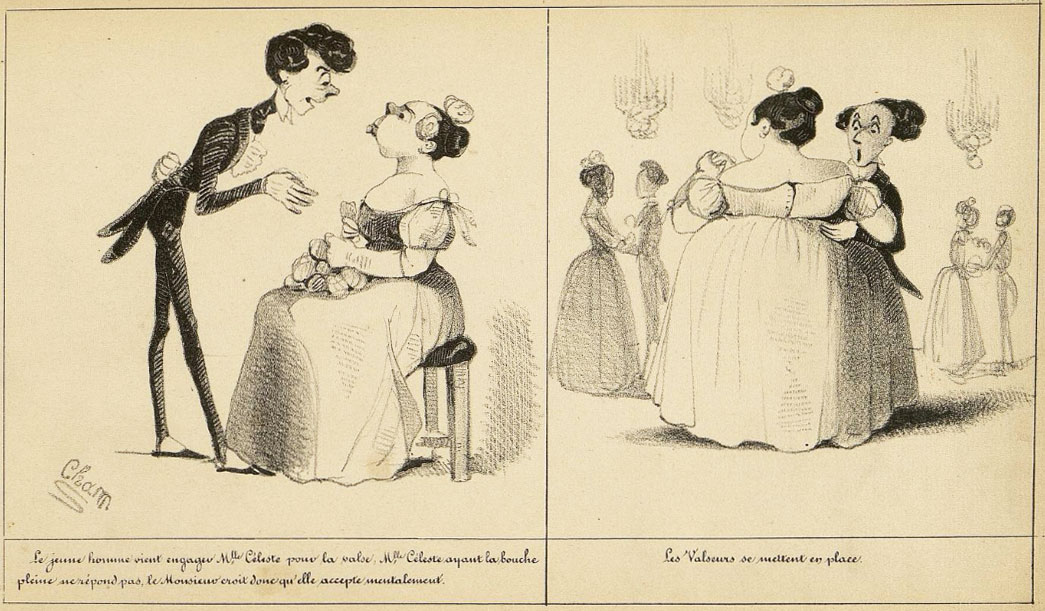 'Deux Vieilles Filles Vaccinées à Marier' (1840) follows two old daughters who are still unmarried, mostly because their mother wasted her children's dowry and none of their suitors are rich either. The comic is notable for some amusing visual gags, such as when the caption reads "the fog was so thick they could see the end of the nose" with an image of a nose floating in white space. In a more cheeky, fourth-wall breaking gag, Cham shows the same image of a closed door twice and states in the caption "that he is too discreet to show the events going on behind it."