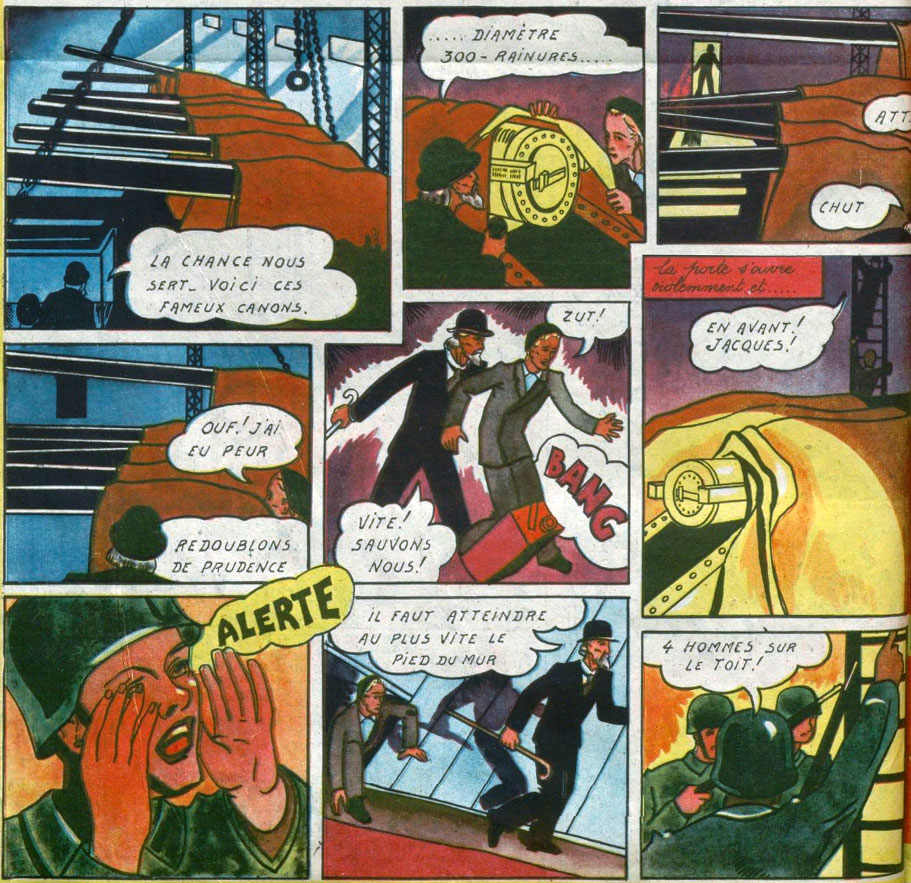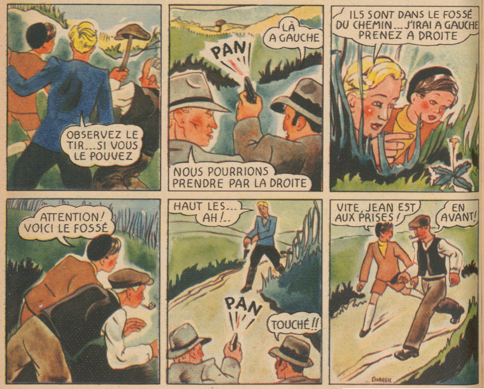 In addition, Chargil created the gag pages with 'Cric et Compagne' (1945-1946, signed "Mac K.B.) and the soldier 'Plouc' (1945, signed "CAAG"), as well as the humorous mystery serial 'Pitchou Détective' (1945-1946) and its unfinished sequel 'Le Hanneton Maximum' (1947). Among Grand Coeur's other comic artists were Max Day ('Billy Window et son Club'), Jacques Laudy ('Buonamico') and Erbé ('Aristide Duracuir'), the latter believed to be an alias of the cartoonist Kari. Also contributing were fellow painters from the Liège art scene, such as Albert Jaminon ('Capitaine d'Artagnan'), Henri Habsch ('Minouche et Rasinette en Jouetie') and presumably also Jo Louis ('L'Apôtre des Montagnes Rocheuses'), as well as a host of female illustrators such as Marie Jaminet ('Valériane et Romarin'), Minou ('Monique au Royaume Humide') and Charles Gilbert's wife, Jenny Collette ('L'Héritière de Ker Naho'). Additional signatures of Léonoël ('Professuer Bismuth'), Saint-Bavard ('La Sagesse du Cadi', 'Monsieur Zizifus'), L. Gillet ('Jan Flibuste'), Wett (''Le Manoir Hanté') and Toussaint ('Histoire sans Paroles') presumably belonged to members of Charles Gilbert's atelier.