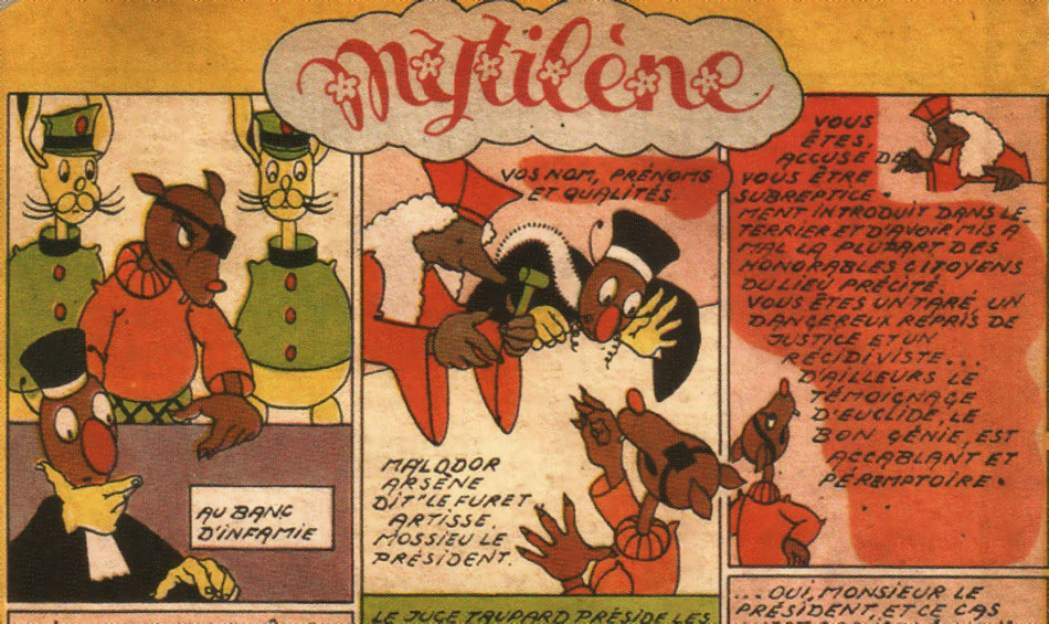 In addition, Gilbert's atelier provided more comics, such as 'Les Tribulations d'Isodore la Poisse' (1947), a humor strip about an unlucky burglar, as well as illustrations for text serials and novels, including 'Robin des Bois' (written by Madeleine Charlier). Simy, the creator of the fairy tale serial 'Nina' (1945-1946), is also believed to be a student of Charles Gilbert, as is "Vincent", the artist of the serial 'Terre Ignorée' (1949). Between 1947 and 1949, Éditions Gordinne published a companion title to Wrill, called Cap'taine Sabord. In issues #80 through #109, Chargil contributed the funny animal comic 'Mytilène', presenting the adventures of the friendly title heroine and Professor Euclide against a cunning thief called The Ferret. This story was also collected in book format by Gordinne.