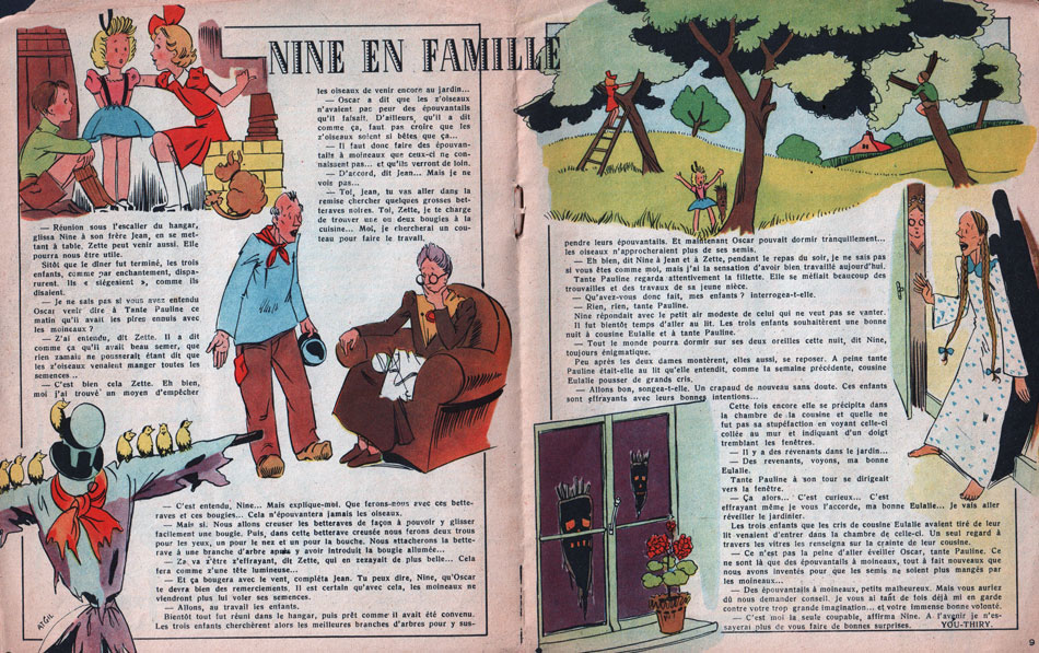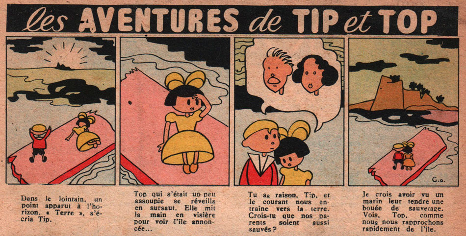 While Gérard illustrated the magazine's title comic 'Nine au Pays des Merveilles' (1944), the other features were Chargil productions. For the youngest readers, Gilbert's atelier created the comic strip 'Les Aventures de Tip et Top' (9 December 1943 - 28 August 1944), which was signed "G.o". After going on a cruise with their parents, the titular boy and girl are stranded on a deserted island after being shipwrecked. With the aid of the monkey Bamboula, and with the parrot Janicou as their interpreter, they have to keep off an attack of grey monkeys. Starting on 24 February 1944, the Imagil team also produced 'Les Frasques de Plume et de Pataqués', a comic strip for teenagers starring a helpful but not too bright boy and a caricatural scientist. Every week, Gilbert's crew additionally provided the artwork for 'Nine en Famille', a richly illustrated soap opera text feature by You Thiery, starring Nine and other characters.