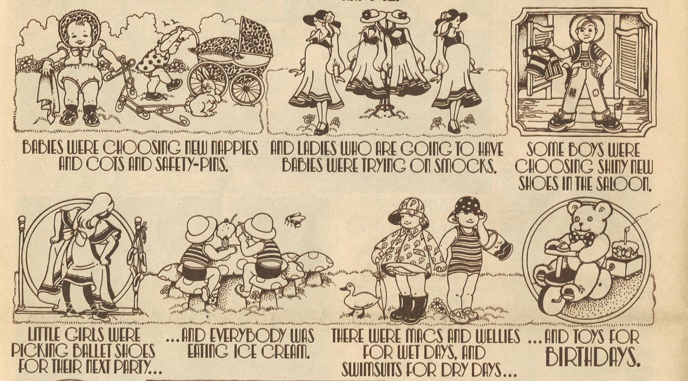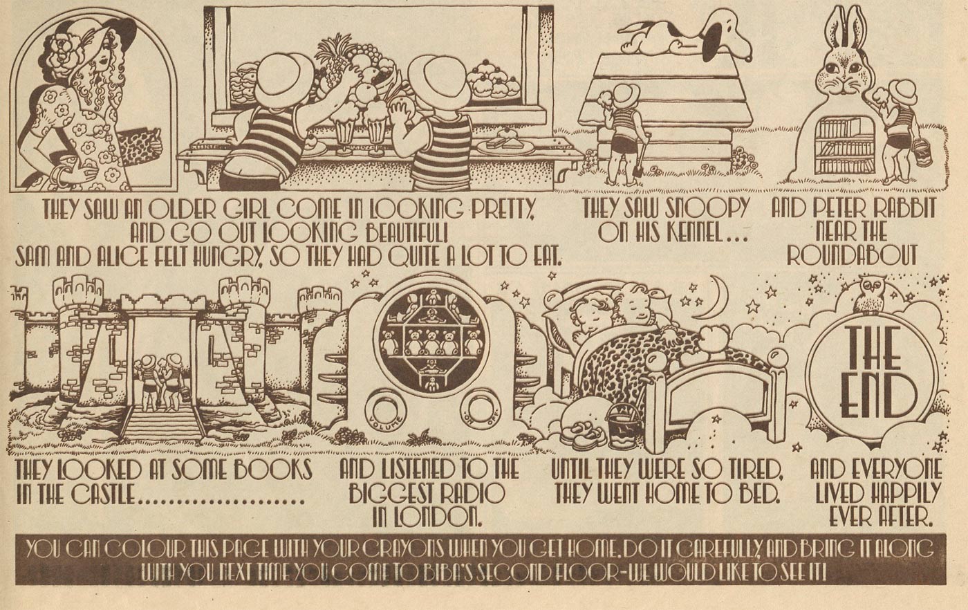 By the early 1970s she was affiliated with the design studio of Tim Whitmore and Steve Thomas. The team had just gotten the assignment to make the designs for the new Big Biba shop, Barbara Hulanicki's leading hip and trendy department store in the Kensington district of London. Charko was brought along as an illustrator, as were Mick Partlett and Chris Angell. Charko made many Art Deco-styled illustrations for the shop, including the logos or signs for each department. She was also largely responsible for the artwork in the Biba newspaper, which appeared around the opening in September 1973. Besides many pinups, the paper also included a comic strip called 'Sam and Alice' about the children's department.