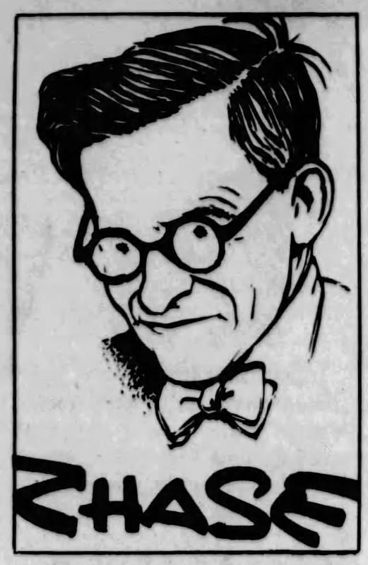 By 1927, Chase returned to New Orleans, and went to work as an editorial cartoonist for local daily newspapers like the New Orleans Item, the Ville Platte Gazette, the Morning Tribune, the Sunday Item-Tribune and the New Orleans States. His cartoons with 'The Little Man' depicted the ordinary man being beleaguered by government and political quandaries. Another regularly featured character was 'Mr. New Orleans', who was typically dressed in a 19th-century long coat with a top hat, bushy mustache and glasses. Chase remained associated with the newspapers until 1964, after which he became the regular editorial TV cartoonist for the local TV station WDSU. Chase drew most of the politicians of his time. Louisiana Governor Jimmie Davis once noted: "The only thing worse than being lampooned by Chase is to have him ignore you."