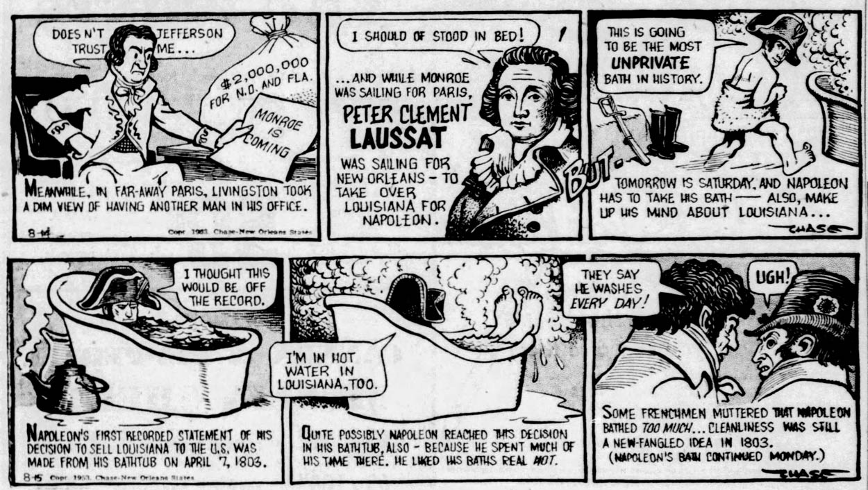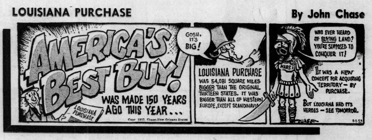 In addition to his editorial cartooning, Chase made a newspaper strip about the 1803 acquisition of the Louisiana territory by the United States from France. The feature, titled 'Louisiana Purchase', was syndicated by the Register and Tribune Syndicate from 5 January until 31 December 1953. Despite its strong educational undertone, the artist didn't shy away from caricaturally portraying well known historical figures and adding both visual and textual humor. The series was collected in the book 'Louisiana Purchase: an American Story' (1954). An expanded and updated edition was published in 1982, which was reprinted in 2002 to commemorate the 200th anniversary of the event.