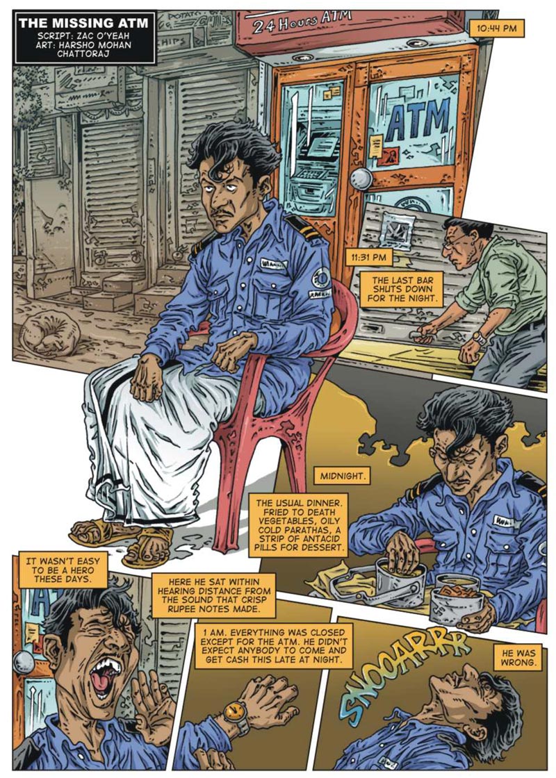 In addition to his local work, Chattoraj's comics stories have been featured in anthologies and magazines from around the world. In 2007, he illustrated Ira Singerman's short story 'The Twelve' for the 10th issue of the 'Negative Burn' anthology by Image Comics in the USA. His stories 'Operation Military' and 'Charlz of Marz' both saw US publications as well in 2009. 'Around the Swiss World in 20 Days' was his contribution to Roy Anindya's Indo-Swiss anthology 'When Kulbhushan Met Stockli' (2009), a project funded and supported by the Swiss arts council Pro Helvetia. In later years, Chattoraj has returned to the pages of Swiss publications: he had his short stories 'Dark Destiny' (2016) and 'Fischgeschichten' (2018) published in Strapazin, while he produced 'Die Giester von Kolkata' ('The Ghosts of Kolkata') with Christoph Schuler for Reportagen.