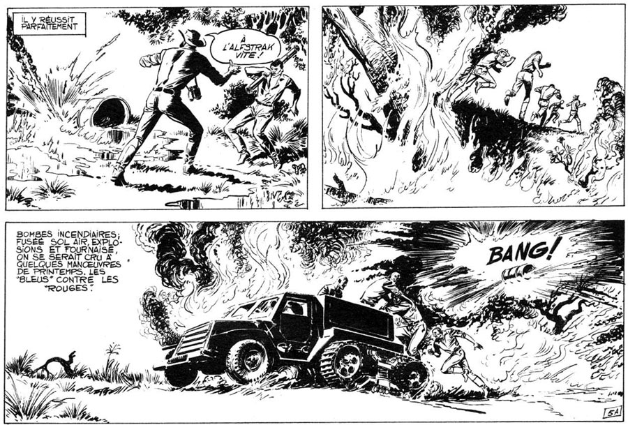 In 1962, Chéret began the association that would define his career. He joined the publishing house Vaillant and its magazine of the same name, initially a publication of the Youth Movement of the French Communists. His first assignment was taking over the aviation comic 'Bob Mallard' (1962-1974). The fighter pilot had made its debut back in 1946, fighting Nazis under supervision of scriptwriter Henry Bourdens and artist Rémy Bourlès. Since 1957, scriptwriter Jean Sanitas and artist Francisco Hidalgo had taken over the series and were still producing it when Chéret succeeded Hidalgo. By the time Chéret assumed the art duties, the World War II theme had been dropped. Mallard was turned into an ace pilot tasked with special missions all over the world, accompanied by his sidekick Puchon. Chéret's powerful and dynamic linework gave the series a new boost, making it last until 1974. But by that point, another hero, Rahan, required all of Chéret's attention. Between 1977 and 1978 Éditions Jeunesse et Vacances reprinted several 'Bob Mallard' stories in six bimonthly comic books.