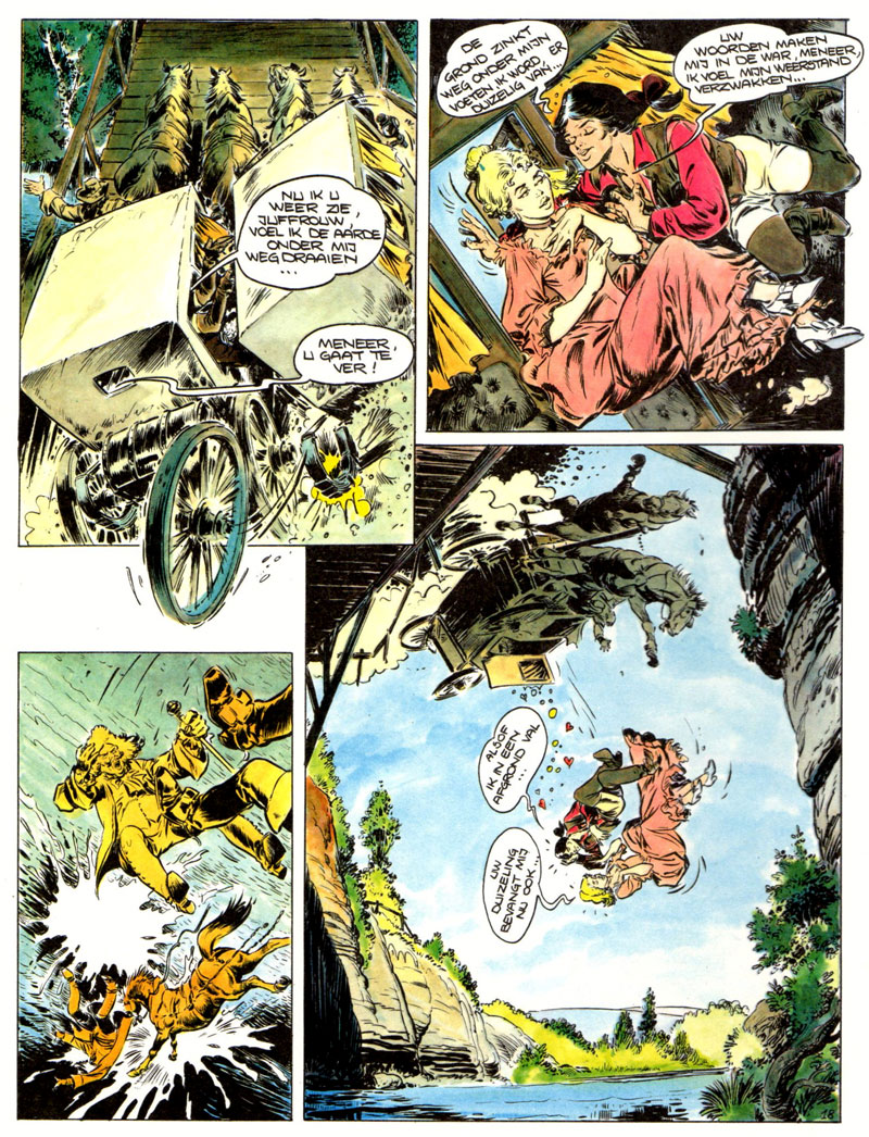 Between 1973 and 1981, Chéret was back in Tintin's pages with the adventure series 'Domino'. Chéret came up with the idea for a clumsy and naïve character after watching the American comedy TV series 'Get Smart' about the clumsy spy Max Smart. With editor-in-chief Greg, he chose the French Régence period (1715-1723) as setting. The courtly and cultivated youngster Domino is sent to Paris, where the priest Porphyre is supposed to train him as a law officer. However, the eccentric priest trains him to become a vigilante crime fighter. In 1974, the very young Jean Van Hamme succeeded Greg as scriptwriter. Lombard collected the series in five albums.