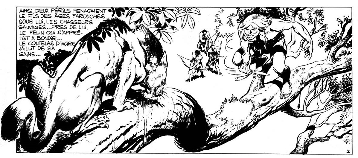 André Chéret was born in 1937 in the Montorgueil-Saint Denis-Les Halles district of Paris. During World War II, the boy and his sisters were lodged with a farmer's family in a small town in Allier. There he developed his interest in drawing, making sketches of animals and nature. His fascination for comics was fuelled by the comics adventures of 'Tarzan', especially those drawn by Burne Hogarth. He also read his sisters' copies of Fillette magazine, where he was particularly captivated by the jungle heroine 'Durga Râni' by Pellos. It is telling that these two comics caught Chéret's attention, since they both foreshadowed the character he would become mostly associated with. Hogarth's detailed anatomy especially was an influence on his 'Rahan' comics.