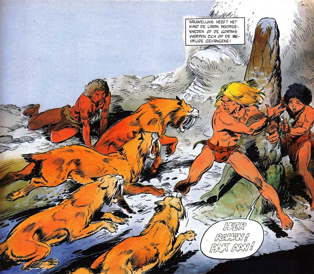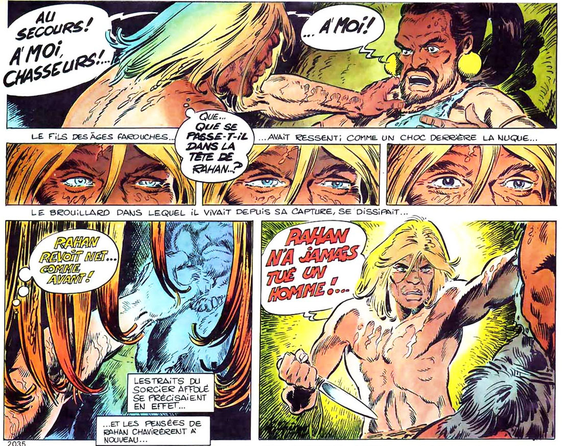 Rahan is a noble being. The caveman helps his fellow men and uses his knowledge of nature to his advantage. He always knows which herbs are poisonous and which ones could be used as medicine. A skilled inventor, he invents the catapult, the hoist, the fishing pole, mirrors as a way to divert light, agriculture and many other innovations. Rahan also understands that certain natural phenomena are definitely not the work of certain corrupt shamans and sorcerers. He informs tribes that these superstitions are nonsense and they are being brainwashed into submission by the town "wizards" and chieftains. Naturally, this occasionally leads to conflicts. During such action scenes, he yells out his battle cry: "RAAHAA!", which could count as his catchphrase. But even then he only uses his trademark white ivory cutlass when necessary. After defeating his enemies, Rahan still shows mercy. Chéret took great care portraying the anatomy of his muscular hero. Wearing only a loincloth, the French press often labeled the comic as "gay erotic".