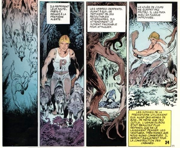 In issue #1 of Pif Gadget, published on 24 February 1969, the first adventure of 'Rahan' kicked off, spread over a full 20 pages. The stories revolve around a wandering caveman, Rahan, created by Chéret and scriptwriter Roger Lécureux. Caveman series had existed before in Franco-Belgian comics, such as Édouard Aidans' 'Tounga' (1961-2007) and the original 'Timour' (1953) by Xavier Snoeck and Sirius. However, 'Rahan' was something different. Despite his primal background, the character shows great intelligence, inventiveness and an almost modern sense of ethics. Nicknamed the "Son of the Dark Age" ("Fils des Âges Farouches"), the young Rahan has lost his entire tribe in a volcanic eruption. All that's left to him is a necklace with five claws, which symbolizes the human qualities taught to him by his adoptive father Crâo the Wild. These virtues are generosity, courage, tenacity, loyalty and wisdom. With these life principles, Rahan wanders through an alternate prehistory, encountering other men ("Those who walk upright") and wild beasts.
