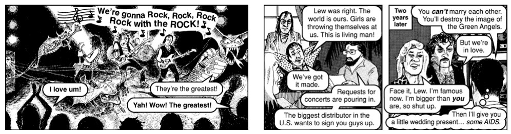 Another aspect of Chick's tracts is the corny dialog. In 'Angels?' (1989), all rock bands - even Christian ones - are managed by Satan. When the band members of a group sell their souls to him, they all die horrible deaths. As the lead singer describes it: "Bobby died of AIDS, Jim O.D.'d and Don is into vampirism." In 'Payback' (2002), queen Jezebel is devoured by dogs, which is described as follows: "After the dogs were finished with Jezebel, not much was left. It was pretty gross." In 'The Bull' (1986), a notorious criminal converts to Christianity and bullies his fellow inmates into following his example, with the words: "As of right now, all killing stops! There will be no more raping, because I just found out that God hates sodomy!"