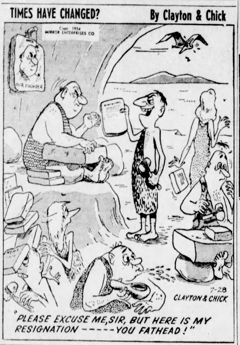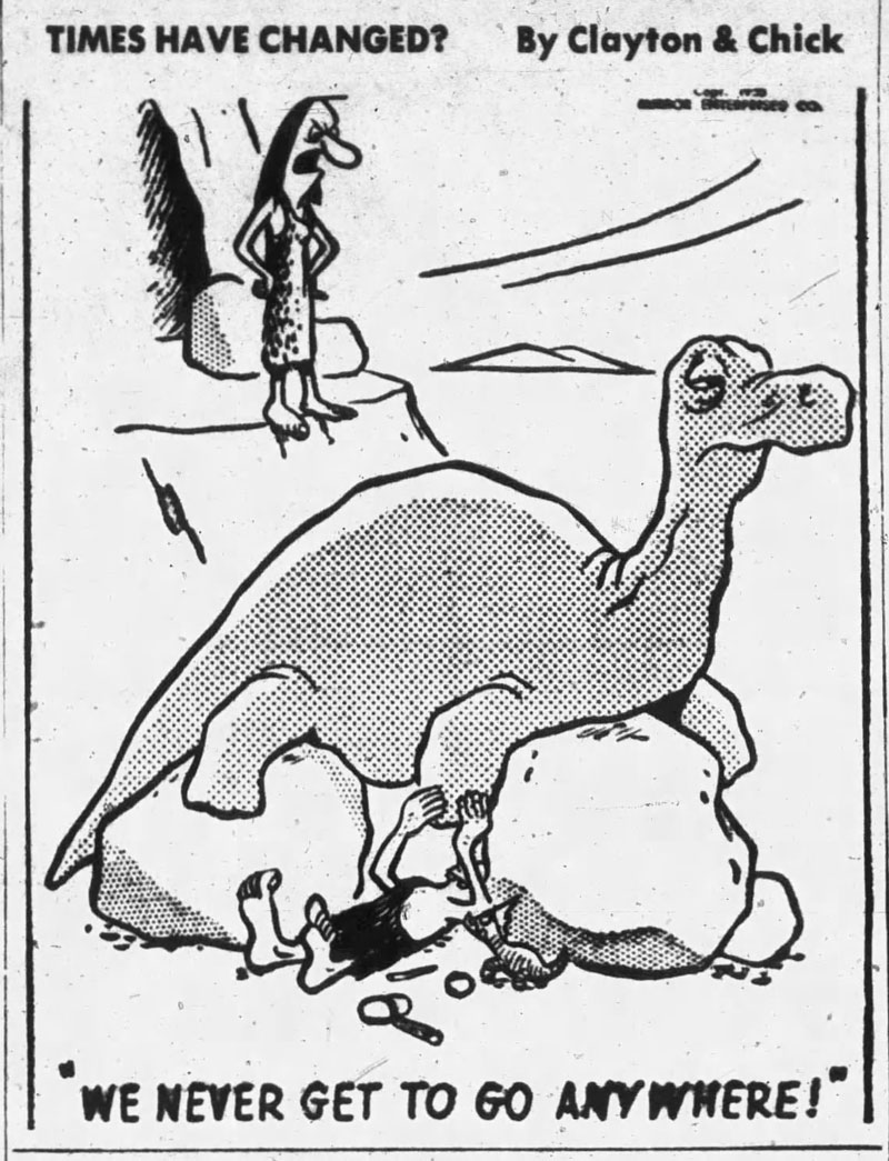 Jack Chick's earliest professional cartoons showed little hint of the kind of comics he became famous for. On 16 November 1953, the first episode of his single-panel cartoon series 'Times Have Changed?' (1953-1955) appeared in print. The cartoons are set in the Stone Age and mostly feature anachronistic jokes. Cavemen and -women are depicted interacting with dinosaurs, mammoths and saber tooth tigers, while living in a 1950s-style modern society. The gags were written by P.S. Clayton and syndicated by the Mirror Enterprises Co. to newspapers in the Los Angeles area. The final episode was published in 1955. Strangely enough, some of the papers erroneously credited Clayton and Chick as "Clayton S. Chick". Allan Holtz of Stripper's Guide has suggested on his blog that it is possible the cartoons may have inspired Hanna-Barbera to their similarly anachronistic Stone Age animated TV series, 'The Flintstones' (1960-1967).