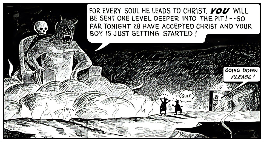 The paranoia doesn't stop there. In 'The Last Generation' (1972), Chick depicts a dystopian pagan society, where animal sacrifice is enforced in schools. Children walk around in Nazi-like uniforms and are brainwashed to report any Christian they see to the police, including their own parents. The Christians are then sent away to mental camps. In this world without religion, chaos and natural disasters are everywhere. In some of Chick's stories, being devout is not enough. His tract 'Flight 144' (1998), for instance, introduces a group of missionaries who have built schools, hospitals and fed and clothed thousands of African natives. But when their plane crashes, they still go to Hell, "because they never told people how Jesus could save them." To add insult to injury, a recently released murderer who became a born-again Christian goes straight to Heaven, even though "the only guy I led to the Lord was my cellmate." In 'The Trial' (1996), a little girl is brought to court for claiming that accepting Jesus as your savior is the "only" way to go to Heaven. She wins the case, because "Jesus wouldn't tell a lie". In the afterlife, the girl goes to Heaven, while a Roman Catholic bishop, an imam, a rabbi, a bible scholar and even her own mother all roast in the eternal fire, simply for having different viewpoints. In his comics, Jack Chick names various media as the Devil's tools. To lure people away from the "good" path, Satan apparently created rock music, Halloween, Wicca, New Age, 'Harry Potter', 'Family Guy', 'Dungeons & Dragons' and even sports. In short, Jack Chick's vision of Hell seems more bleak and narrow than Hieronymus Bosch, since it's nearly impossible to avoid "sinning".