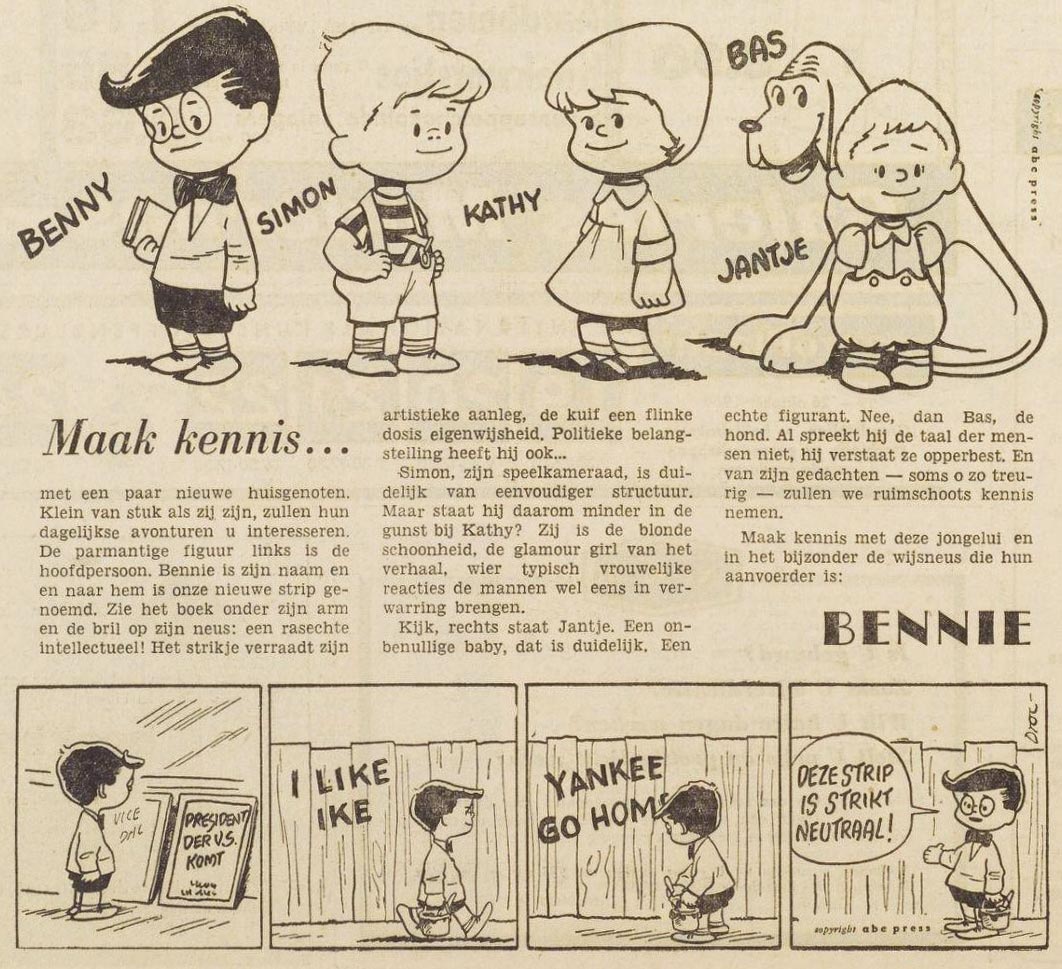 Title hero Benny is an intellectual kid, with both artistic and political talent. In a style very similar to the early 'Peanuts' strips by Charles M. Schulz, most of the humor is drawn from the kids' adult and at times philosophical dialogues, commenting on current affairs and complaining about the hardships of everyday life. Much like Charlie Brown, Benny also has an anthropomorphic beagle, with a similar mind of its own. 'Benny' ran as 'Bennie' in the Dutch newspaper Het Vrije Volk from 18 October 1960 until 17 April 1961. The British publication ended on 14 October 1961.