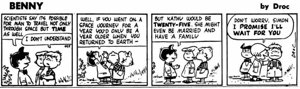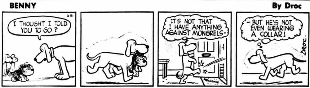 Derek Chittock was most likely also a cartoonist for the leftist newspaper The Daily Herald in London from at least 1959 to 1964. In his index of Daily Herald cartoonists on John Adcock's Yesterday's Papers blog, Leonardo De Sá mentions that Derek Chittock is the real name of the cartoonist "Droc", who was responsible for the short-lived kids' gang comic 'Benny' (1959-1961). The strip debuted on 27 July 1959 and the lead character was introduced as the leader of "the brainiest, zaniest, bunch of kids you'll ever know."